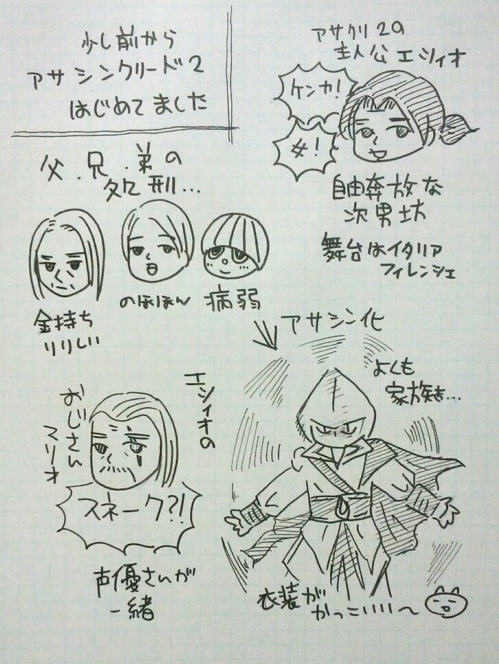 アサシンクリード2はじめました。と書きましたが、本当は1週間前ぐらいにはじめてました 日記に書かなかったのは、主人公のエツィオさんがまだアサシンになっていなかったのです 舞台はイタリアフィレンツェ。銀行業をやっている家の次男坊で、自由奔放に生きているエツィオさん 女といちゃいちゃしたりケンカして追われたり、なかなかアサシンにならないのですよ そうこうしている内に冤罪で父、兄、弟が処刑されるのを目の前で見てしまったエツィオさん 家族の復讐のためにアサシンに…なったのですが 直接手を下した相手を暗殺した後は『もういい…』と 母と妹を連れて安全な場所へ行くつもりだったのですが 伯父さんのマリオが現れ、裏でやいのやいのやってる連中がまだいるんだよと教えられ アサシンとしてやっていくエツィオさんなのでした …まで進めたので絵日記にしました 今回は防具や武器を選べたり、お金が稼げたり1と色々変わっております マップも広いし『ゲームは1日2時間』では足りません!! |
