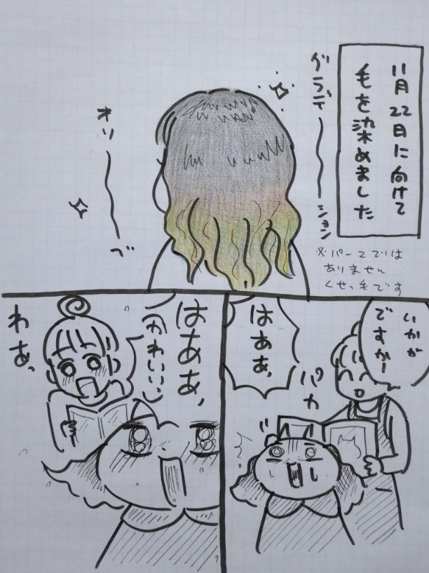 来週のトライセラトップスのライブに向けてテンション上げるため 20年振りに毛を染めました! 全体的に染めると職場でなんやかんや言われそうなので 毛先にかけてグラデーションになるように 毛先はオリーブにしてもらいました! 可愛いです!! トライセラのライブに行くまでに バスで行くのから西九州新幹線に変更になったり 新幹線にしたので交通費が倍になったり 博多駅から天神までの道がわからなかったり 色々と不安がありましたが『この髪を3人に見せる!』と 行くのに前向きになりました (3人は私に気づきませんが) なんとか無事にたどり着けますように 絵では上手く描けなかったので写真で と、写真撮ったけど難しい ブログはじめて16年で初実写豊川 16年もやってんのか!?頑張ってんなー PR |