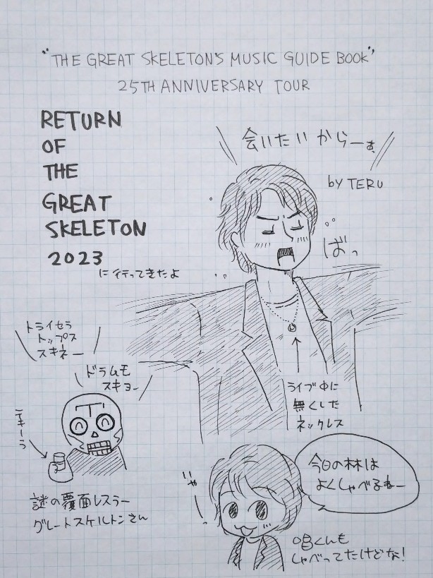 10月15日は福岡にTRICERATOPSのライブ ザグレートスケルトンズミュージックガイドブック25THアニバーサリーツアー リターンオブザグレートスケルトン2023を見に行ってきたよ! 長いのでカタカナにしました ザスケルトンズ~は2枚目のアルバムで アルバム発売から25年も経ったんですねー! へー!もうそんな前だしまだ私がトライセラ知らない時期 ツアー最終日でみんなで盛り上がってよかったね この日は林くんがノリノリで、いつもより喋っていたし(唱くん調べ) よく歌ってた。GLAYのウインターアゲインの 『会いたいから~ぁ』を何度も歌ってた ご機嫌 アンコールにはメキシコから来た謎の覆面レスラー 『グレートスケルトン』が乱入してドラム叩いてた 道に迷ってたらトライセラの楽屋まで来てしまったらしい んで物販見てから帰るらしい(実際見に来てた。豊川は見れなかった) あの覆面も今回の為に作ったのかなーちゃんとサイズ合わせもしたのかなー その辺の話も聞きたいね タイトルにもあるようにライブの中心はセカンドアルバムの曲がほとんどで アレンジも変えていたし、歌詞も一部変わってた どう変わっていたのかこれもちゃんと知りたい 会報とかホームページに載らないかなー?? あと数年後には御三方50歳だってよ! 林くんが50?? そんなナイスミドルな林くんも見に行けたらいいな それまで豊川も元気でいなくちゃ!! |