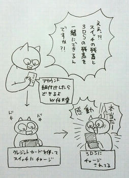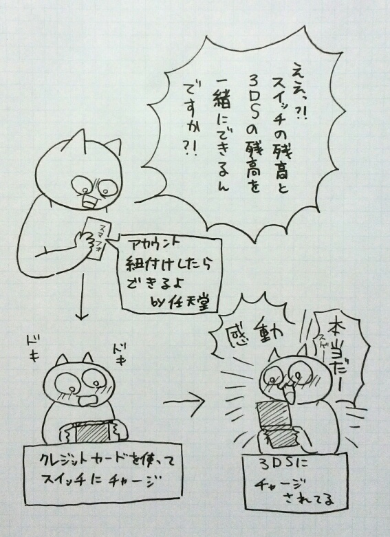 何年かに1度思い出す事がありまして。それは ゲームボーイでやってた『がんばれゴエモンさらわれたエビス丸』が いっつも同じ所でゲームオーバーになってクリアできなかった という事を 今回は何気に検索してみたらなんと3DSで遊べるんですよ! 何てこと!これはダウンロードしてクリアせねば!あの時の気持ちを今達成してあげなければ! と、ダウンロードしたいのですが 今はもう3DSはクレジットカードを使って、残高のチャージができなくなっておりまして お店でプリペイドを買っても1500円から。コンビニのマルチコピー機を使っても1000円なので そんなにいらないんですよねー。残高残っても勿体ないしーと、調べたら スイッチと3DSのアカウントを紐付けしたらチャージ残高を共有できる!そうです! これだったら多目に3DSへチャージして残っても、スイッチで使える!もったいなくない! で、紐付けしてスイッチからクレジットカードをつかってチャージしたあと3DSを確認したら… 3DSにその分の金額があるではありませんか!!! 任天堂さん神!!!! これで心おきなく『がんばれゴエモンさらわれたエビス丸』をダウンロードできます ついでに『カエルの為に鐘は鳴る』もダウンロードします あー…でも…ウィッチャー3に夢中なので今はやらないですが… |