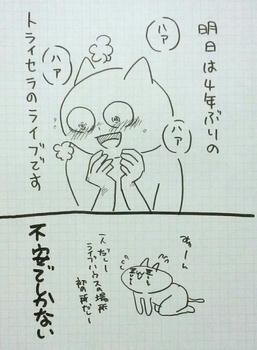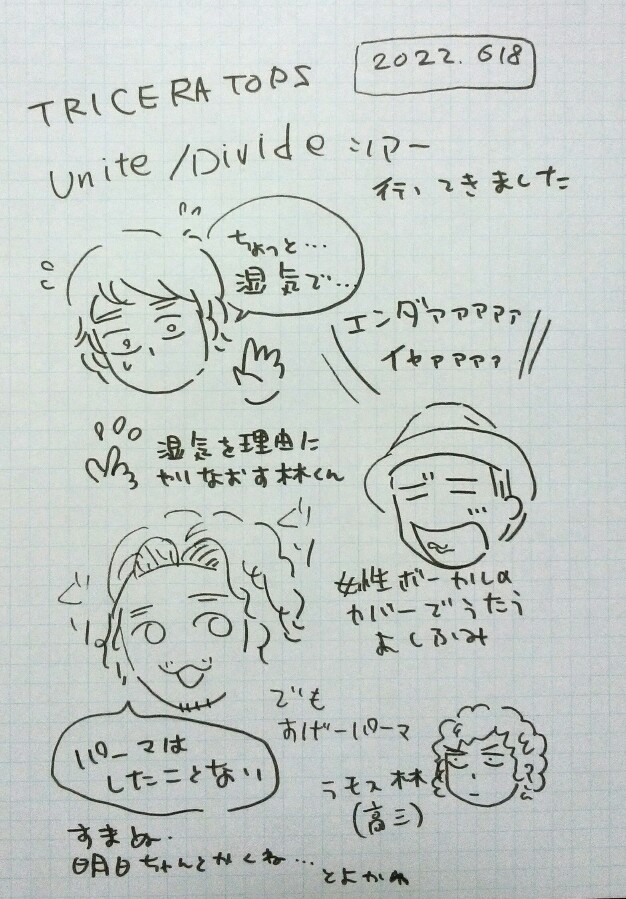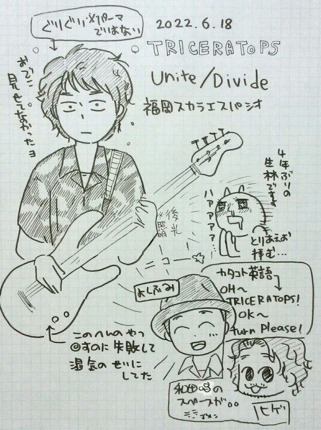 今日はもうぐんにゃりなので、明日ちゃんと書きます 昨日の続きです↓ ちゃんと書くとかいいながらちゃんと書けてない トライセラのアルバムツアーに行ってきました! 4年ぶり!初めて行くライブハウス!一人!高速バスの最終便は8:50! と、不安だらけでしたが、いやー行って良かったですよ! アルバムツアーなのでほとんどの曲はアルバムから。しかも曲順もほぼ同じ(数カ所違う所もございましたが) 福岡は湿気が多いという話になり、メンバーみんなくせっ毛&天パという事で 『パーマあててないのにパーマあててる』のがあるあるらしい んで唱君は一度もパーマあてたことがなくて 佳史はデビュー当時にストパーあててて 林君は高三の時にパーマあててて『ラモス瑠偉』みたいだったそうです 『日本人ならお茶漬けやろ!』と言うてました。古いCM… 曲の出だしにベースの回すやつ(正式名称不明)を回しそびれて 『福岡の湿気のせい!』と言い訳しとりました カバー曲をするにあたって女性ボーカルをやってなかったので、今回は女性ボーカルを…と歌い出そうとして 佳史がホイットニーヒューストンのI Will Always Love Youを歌ってました もちろんネタです すげー高音でしたよ。かっこいよね佳史 調べたら2016年にも歌ってた。日記つけててよかった~ んで、真面目に歌ったのはカーペンターズのClose to youでした。よきよき 久しぶりの福岡&ライブでしたが無事に帰って来れて良かったです 行く前のあの不安って何だったんだろうね でもきっと次行く時も不安で寝れなくなるのかな? 唱くんがMCで『人生嫌な事もあるけど、みんな自分を信じて、自分に自信を持って』って言ってくれて 泣きそうになったし、何だか救われました もちろん会場のみんなに言ったので豊川がそんなに反応しなくてもいいのですが また会える日まで頑張ろう PR |