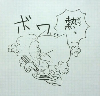 餅が熱くて、きな粉をまき散らす女
