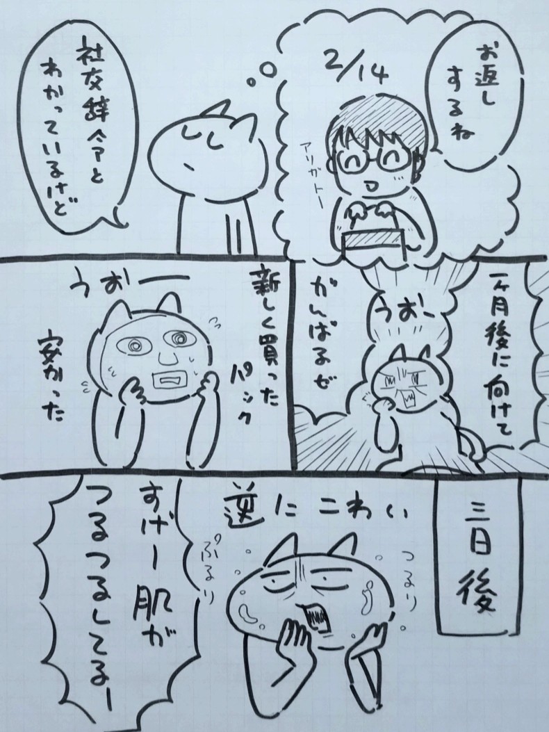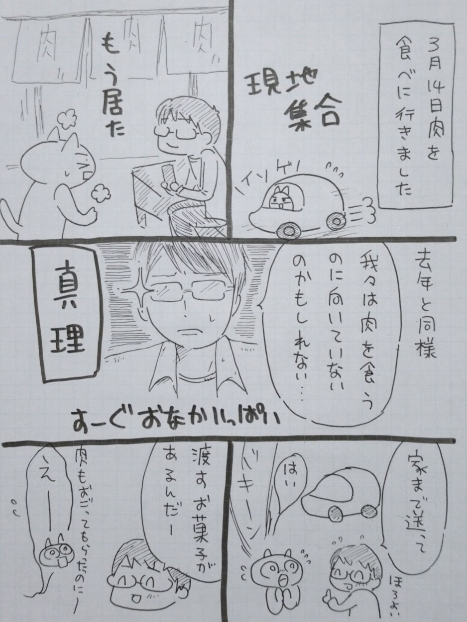 ホワイトデーに肉を食べに行きました ありがたい話しですよ なんですが少食同士なので、量を食べる事ができず 不甲斐ない結果に終わりました 私には良き思い出となりましたけど 好きな人はお酒を飲まれたので送って行ったのですが (と言っても車で数分の距離) 『ホワイトデーのお菓子あるからこっち来て』と、部屋の前 玄関先に案内されまして… 今までどこに住んでるかまでは知ってたけど どの部屋までとは知らず、今回知る事となり これは本当にストーカーになってはいけない度が高まりました んで玄関で待ってたら、大量のお菓子をいただいてしまって なんか、私は小さいチョコをあげただけなのに お肉もご馳走していただいて、お菓子も貰って、申し訳無さ満載 『わー!こんなにお菓子!』とか言ってたけど ふと(これは…お部屋に上がってしまうシュチュエーションなのでは???は?) と一瞬過ってしまいましたが なんせヘタレの豊川さん。そんな事ができるわけもなく 『じゃ…今日はありがとうございました…おやすみなさい』と 帰りました! 帰りましたよ! そんな勇気なんて無い!! 帰ろ!帰ろう!! でも、帰って正解だった 肉で胃袋が胸焼けしてて床に沈んでた PR |